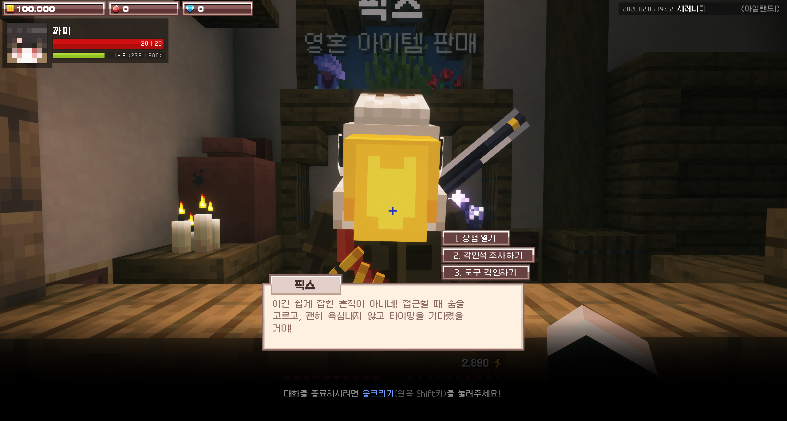 픽스를 클릭하여 인사합니다. 2번 키를 눌러각인석 조사하기를 선택합니다.