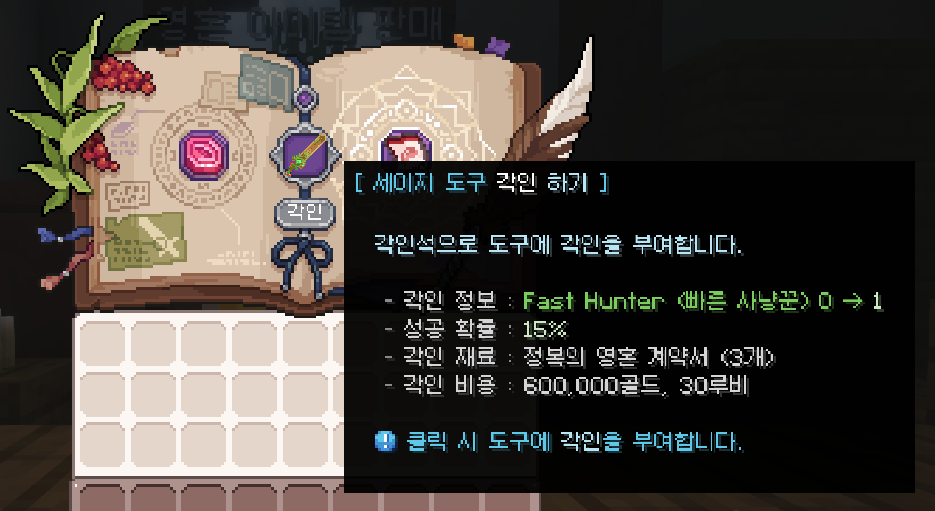 도구 각인은 야생 장비에 인챈트를 부여하는 것과 유사한 개념으로, 세이지 도구에 특별한 효과를 추가하는 강화 시스템입니다. 각인석과 영혼 계약서를 사용해 각인을 진행할 수 있으며, 성공적으로 각인된 효과는 도구에 고정되어 적용됩니다. 이를 통해 세이지 도구는 기본 성능을 넘어, 유저의 플레이 스타일에 맞춘 특화된 도구로 성장하게 됩니다.