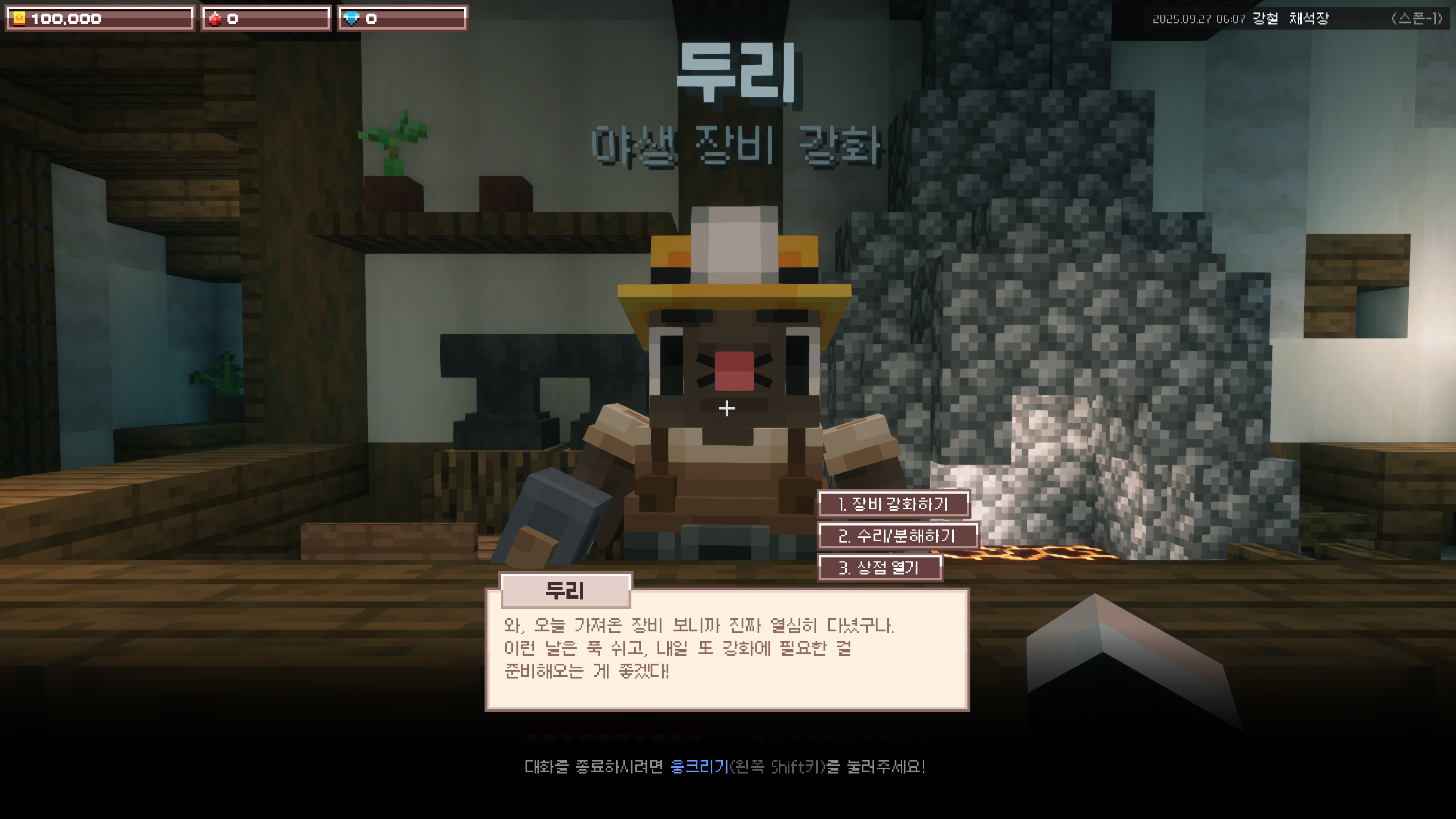 두리를 클릭하여 인사합니다. 1번 키를 눌러장비 강화하기를 선택합니다.