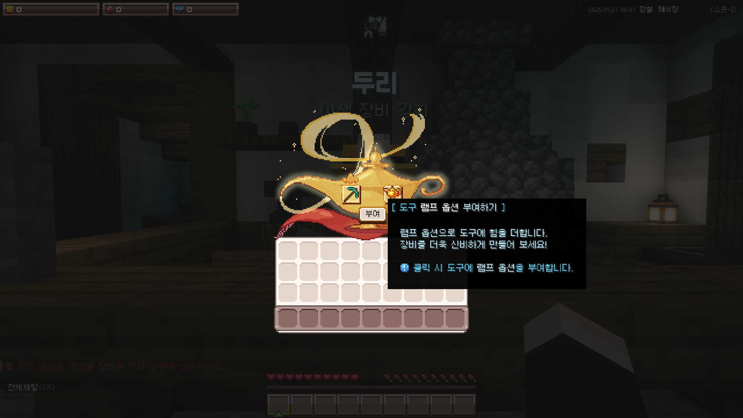 램프는 장비에 특별한 효과를 부여하는 시스템으로, 인챈트와는 다른 방식으로 작동합니다. 램프를 사용하면 장비에 특정 상황에서 발동하는 옵션이 추가되며, 유저는 더 다양한 플레이 스타일을 즐길 수 있습니다. 램프는 크게 작업 램프와 탐험 램프로 나뉘며, 각각 광물 채광이나 자원 채집, 혹은 야생 탐험 등 다양한 활동에 특화된 효과를 제공합니다.
