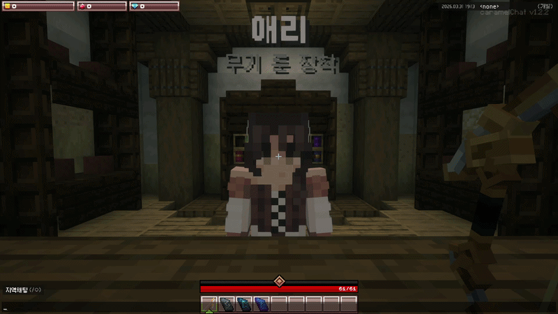애리를 클릭하여 인사합니다. 1번 키를 눌러룬 장착하기를 선택합니다.