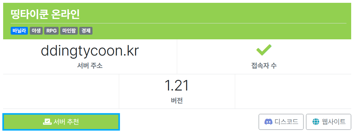 서버 주소는 좌측에 ddingtycoon.kr을 클릭하여 복사할 수 있습니다.