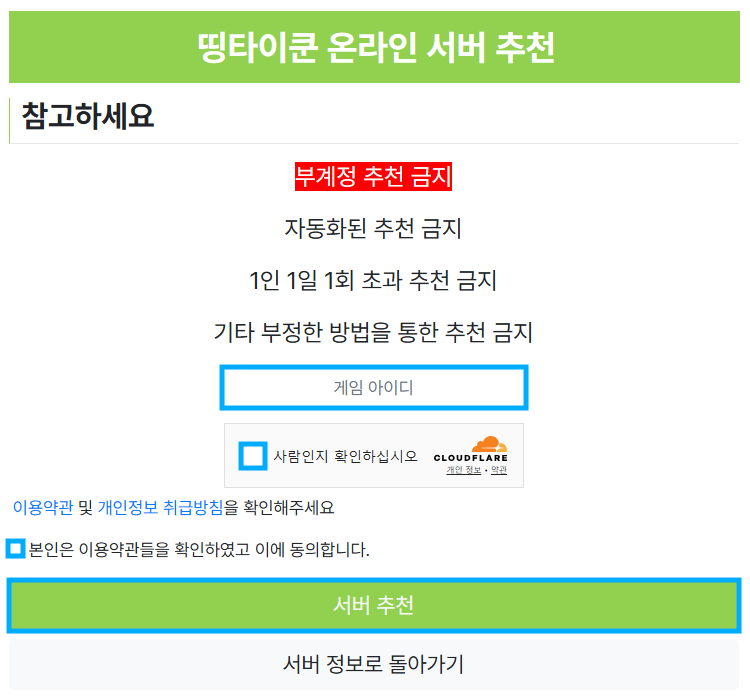 1. 자신의 게임 아이디를 입력하고 서버 추천을 완료합니다.