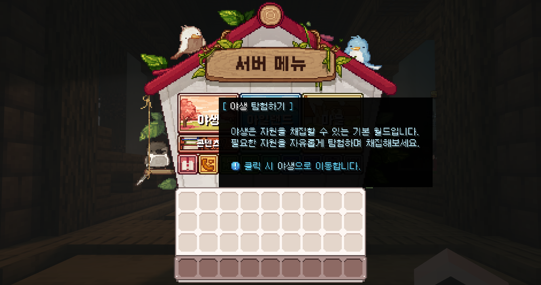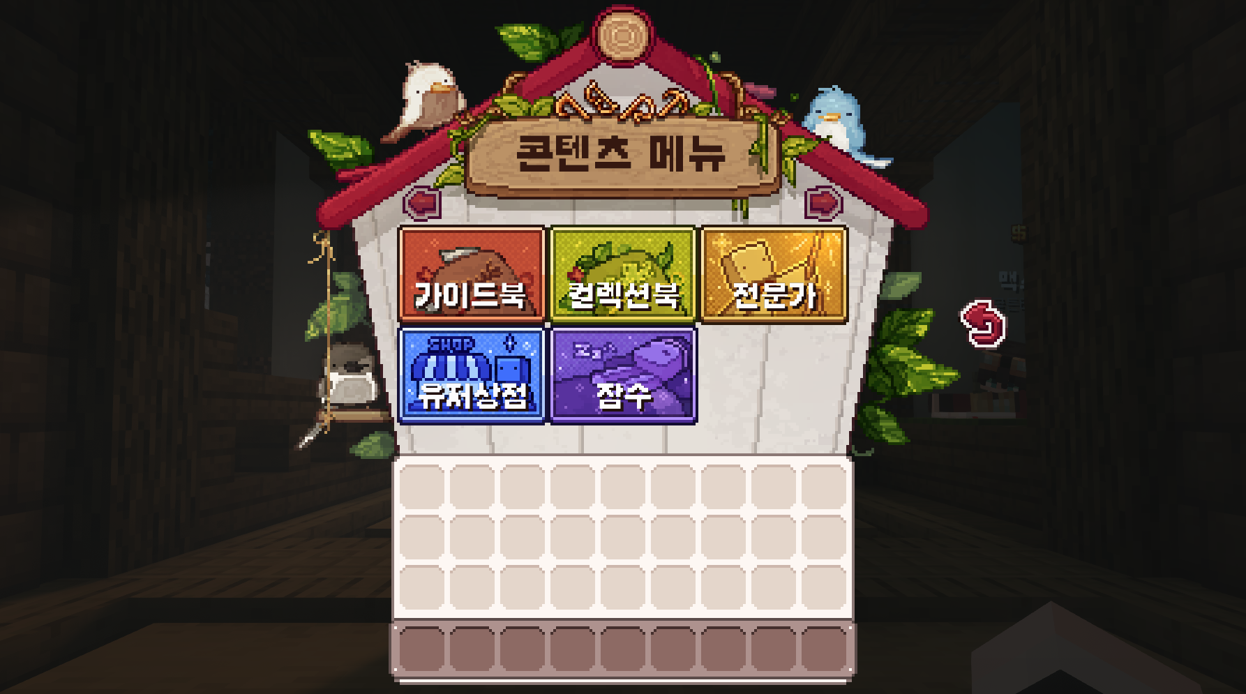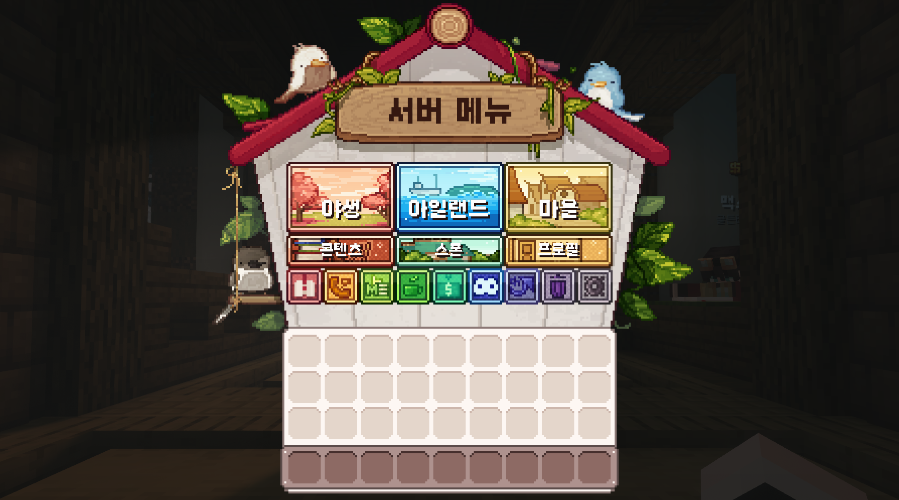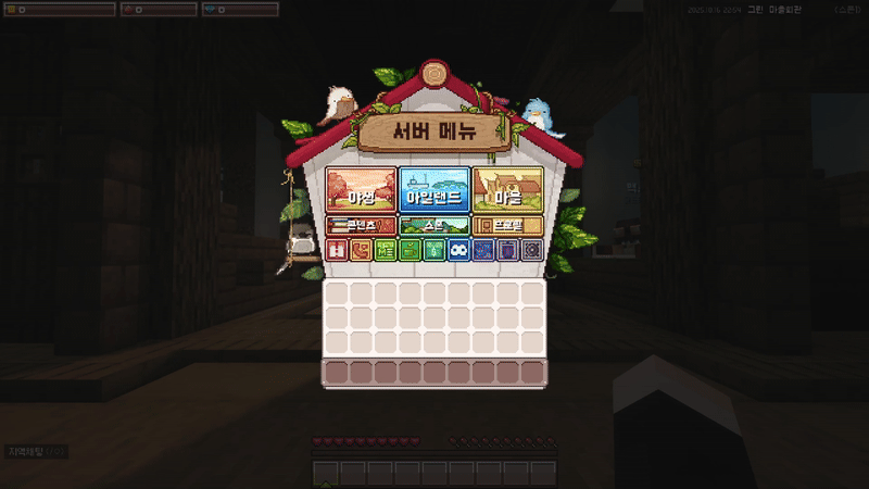 메뉴는 서버의 핵심 기능을 모아둔 중심 인터페이스로, 탐험과 생활, 마을 관리, 개인 설정 등 다양한 시스템을 한곳에서 확인할 수 있습니다. 야생·아일랜드·마을 같은 주요 카테고리부터 프로필, 콘텐츠, 사이트, 채널 등 세부 기능까지 모두 메뉴를 통해 접근할 수 있어 서버 활동을 편리하게 이어갈 수 있습니다.