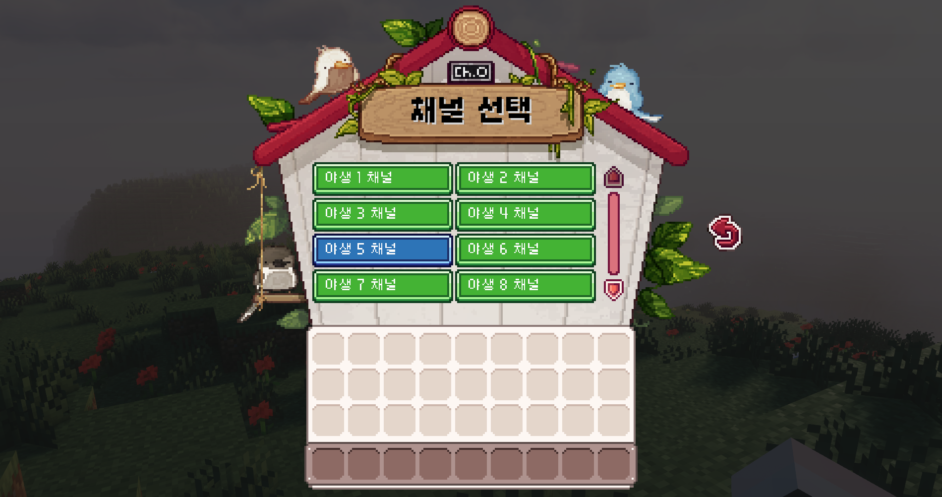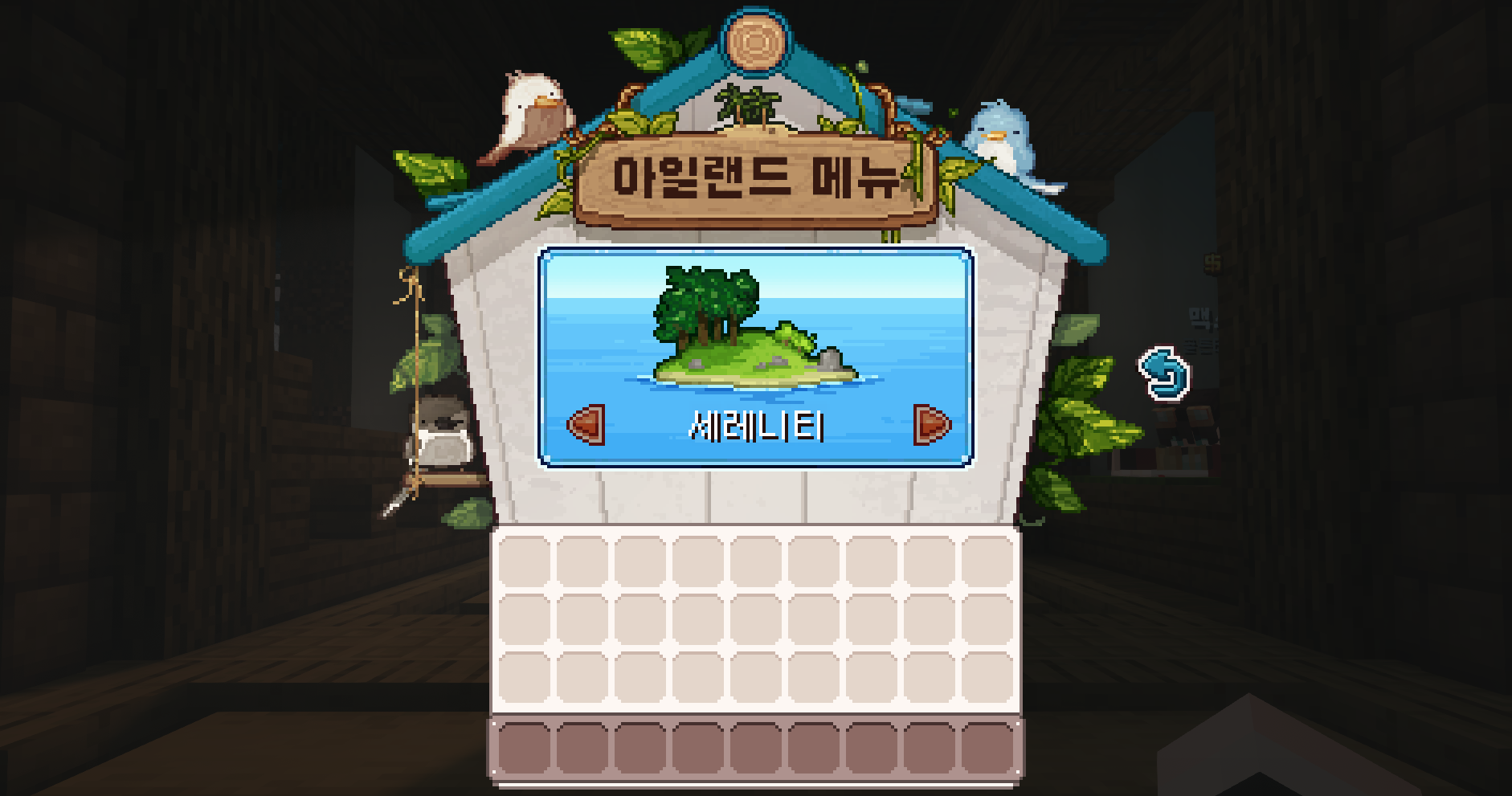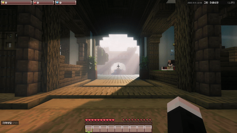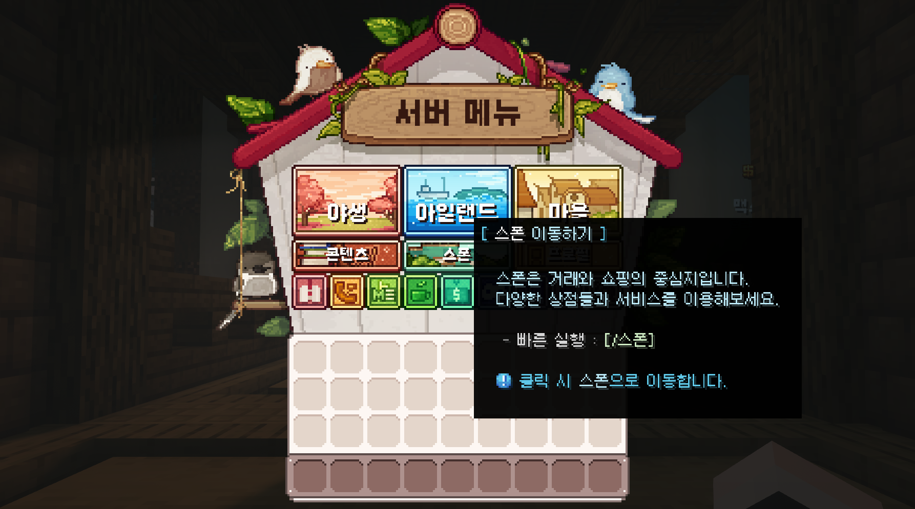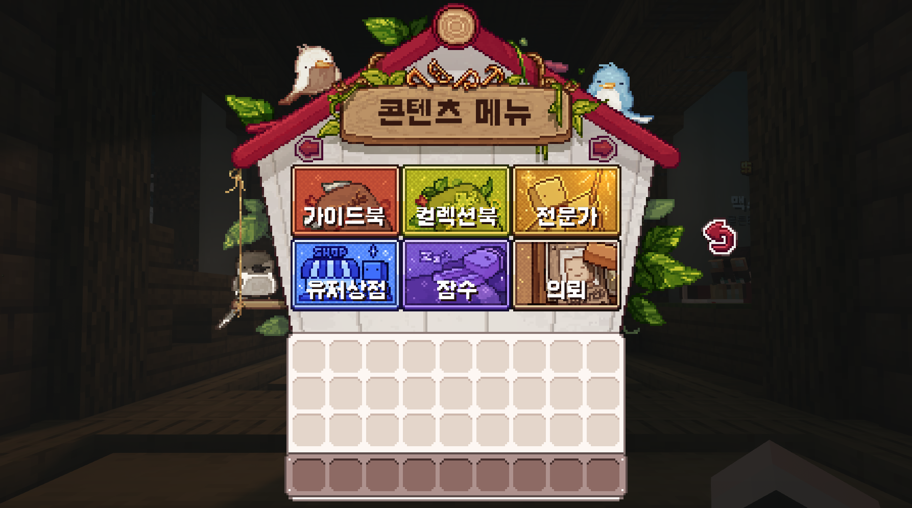 메뉴는 서버의 핵심 기능을 모아둔 중심 인터페이스로, 탐험과 생활, 마을 관리, 개인 설정 등 다양한 시스템을 한곳에서 확인할 수 있습니다. 야생·아일랜드·마을 같은 주요 카테고리부터 프로필, 콘텐츠, 사이트, 채널 등 세부 기능까지 모두 메뉴를 통해 접근할 수 있어 서버 활동을 편리하게 이어갈 수 있습니다.
