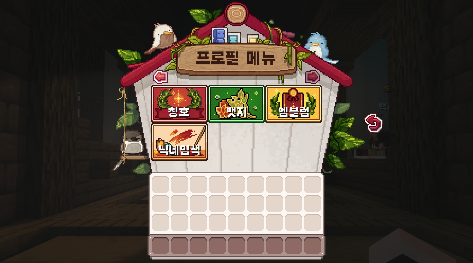 프로필을 클릭하여 내 정보, 가방, 마이홈, 우편함, 장비, 치장, 칭호, 뱃지, 엠블럼, 닉네임색상 메뉴를 확인할 수 있습니다.
