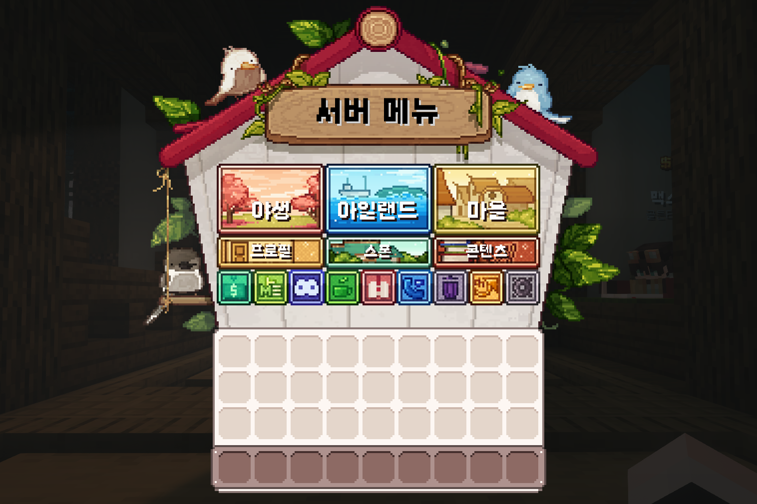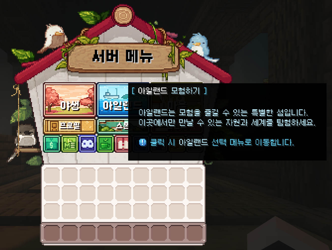 아일랜드는 띵타이쿤 온라인만의 오픈월드 지역으로, 기존 마인크래프트의 야생과는 전혀 다른 새로운 환경을 제공합니다. 이곳에서는 독자적인 채집 시스템을 통해 자원을 모으고, 자신만의 방식으로 성장하며 살아갈 수 있습니다. 자유로운 탐험과 자원 수집, 그리고 생활이 어우러진 아일랜드는 유저의 새로운 모험이 시작되는 특별한 공간입니다.