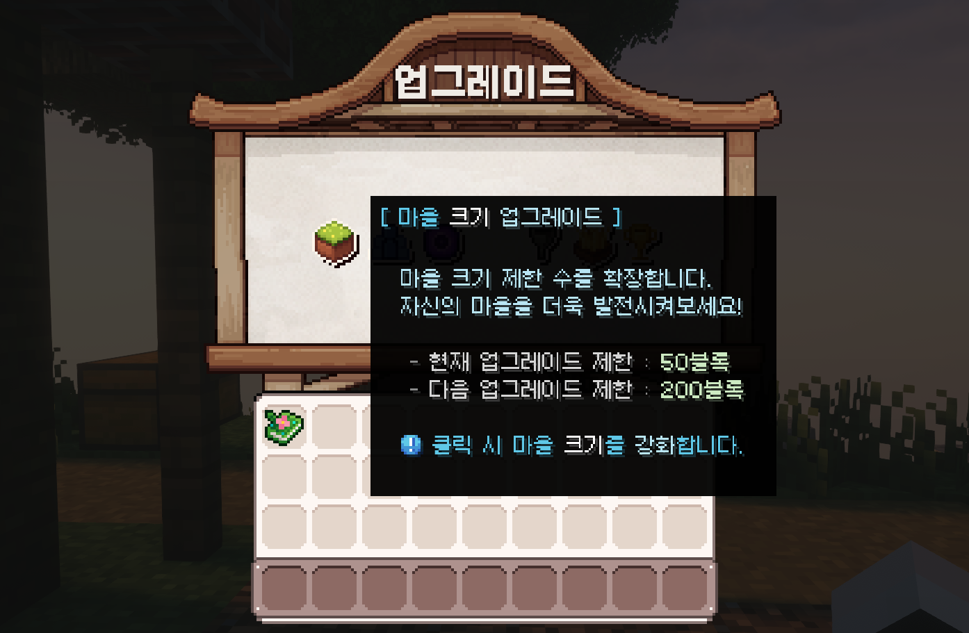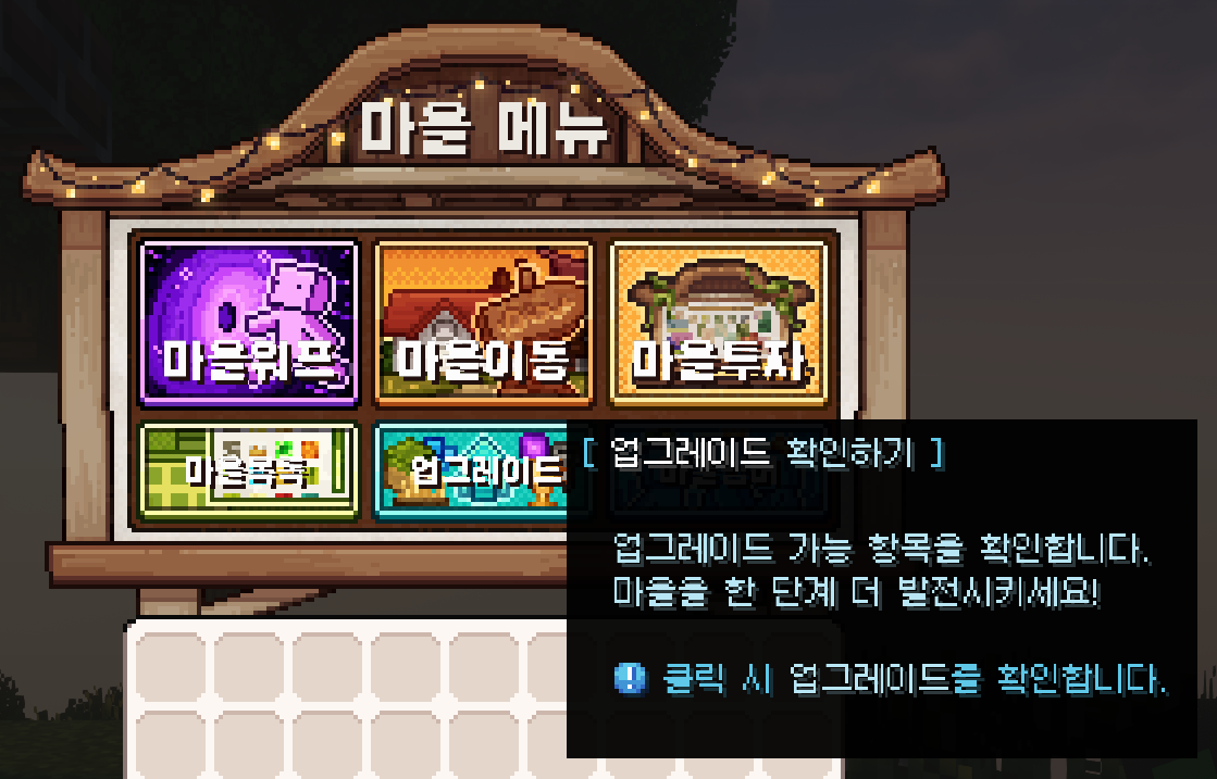업그레이드는 마을의 성장과 편의성을 확장할 수 있는 시스템입니다. 업그레이드를 진행하면 마을원 수, 마을 크기, 경작지 설치 개수, 호퍼 설치 개수, 트로피 설치 개수 등이 단계적으로 증가합니다. 이를 통해 마을의 생활 범위가 한층 넓어지고, 다양한 기능을 보다 자유롭게 활용할 수 있으며, 꾸려가는 마을의 성장 가능성도 크게 확장됩니다.