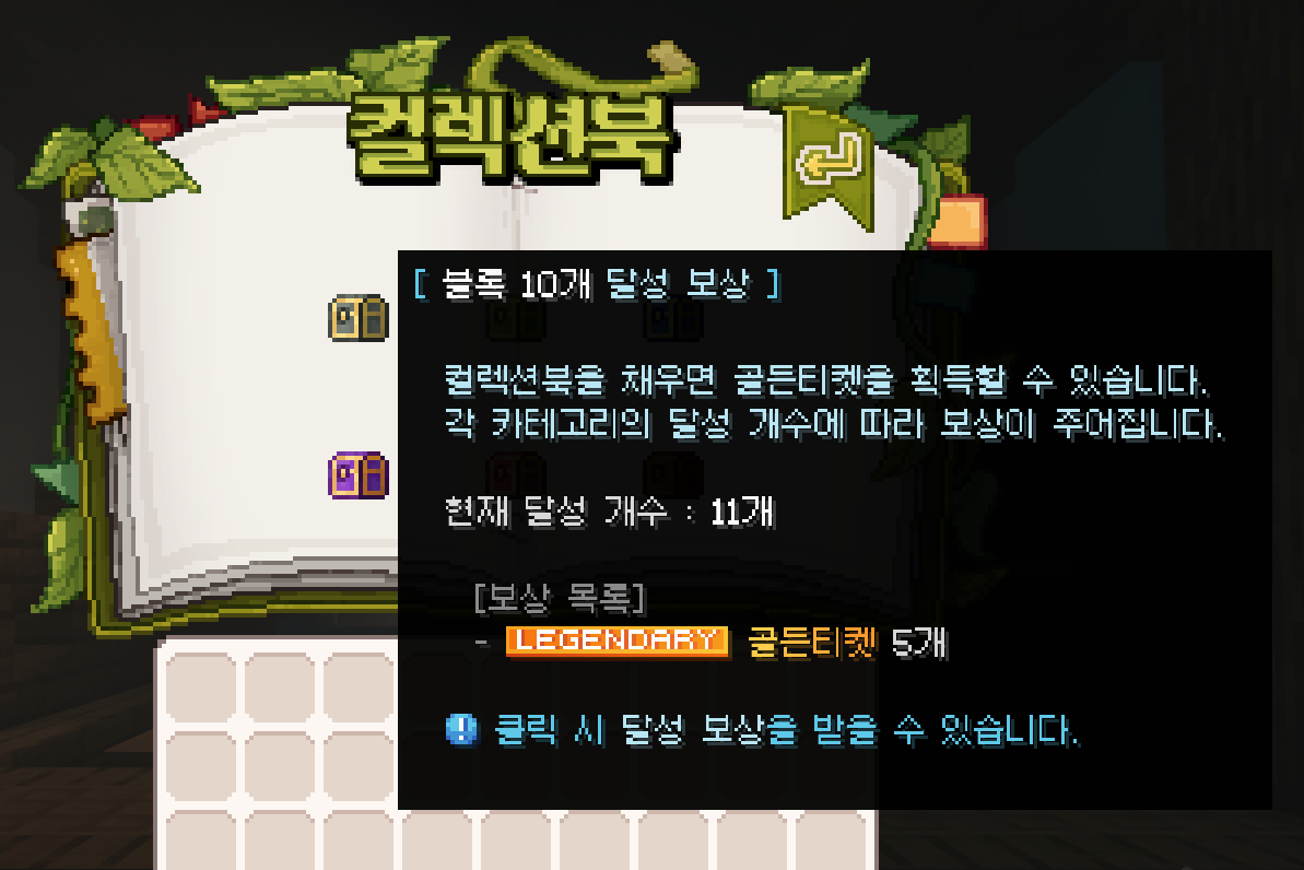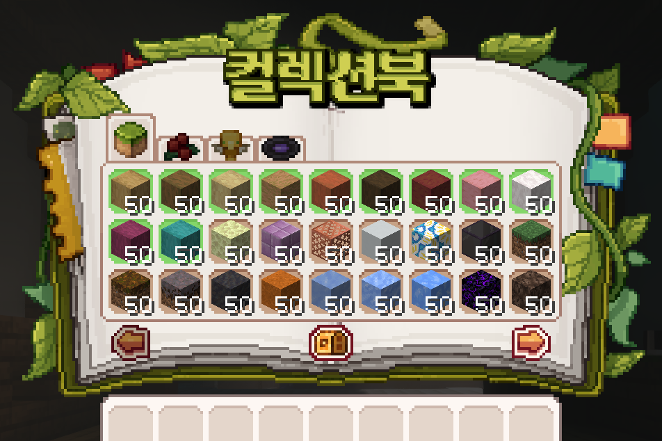 컬렉션은 띵타이쿤 온라인의 시그니처 시스템으로, 야생을 탐험하며 얻을 수 있는 다양한 자원을 도감에 기록하는 컨텐츠입니다. 총 200종의 아이템이 준비되어 있으며, 이를 모두 수집하면 서버의 다양한 보상을 얻을 수 있습니다. 컬렉션은 단순 수집을 넘어 야생을 배우고 즐기는 핵심 요소입니다.