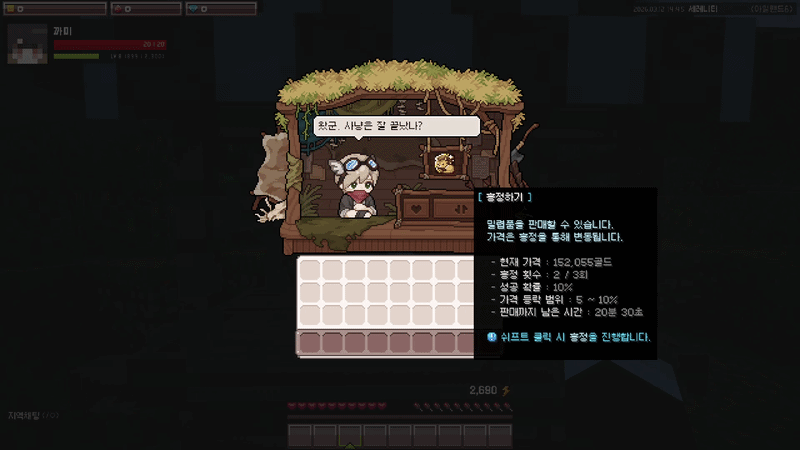 흥정은 수렵꾼과의 호감도에 영향을 받는 거래 기능입니다. 호감도가 높을수록 흥정 성공 확률이 높아집니다. 흥정은 한 번의 거래당 최대 3번까지 시도할 수 있으며, 성공하면 판매 가격이 5~10% 증가하고 실패하면 5~10% 감소합니다.
