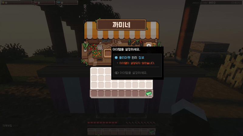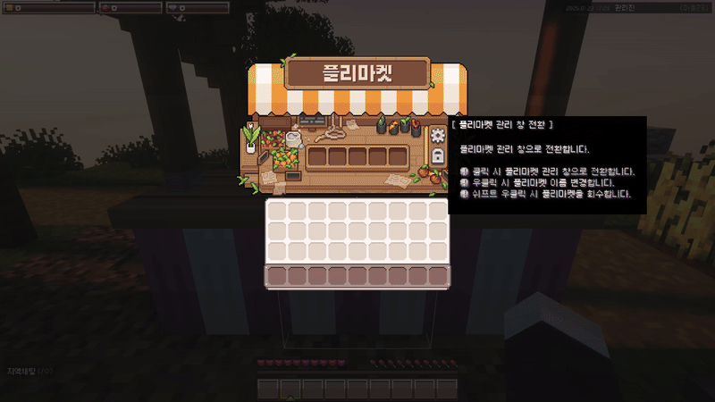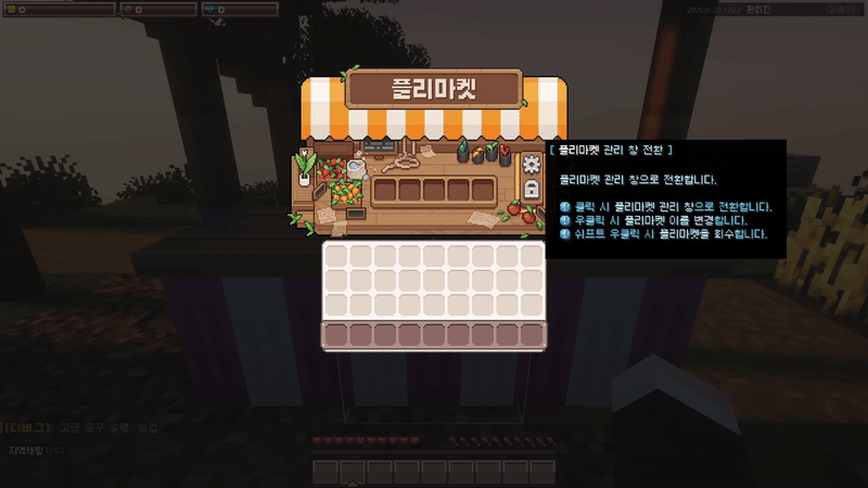관리 아이콘을 쉬프트+우클릭하여 플리마켓을 회수할 수 있어요.